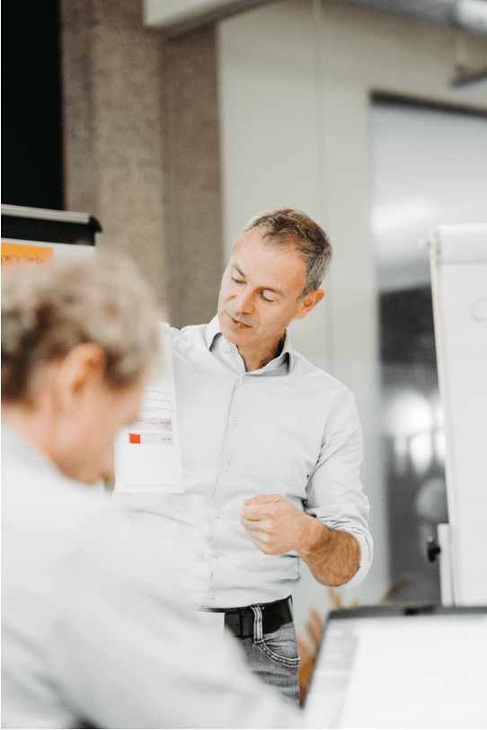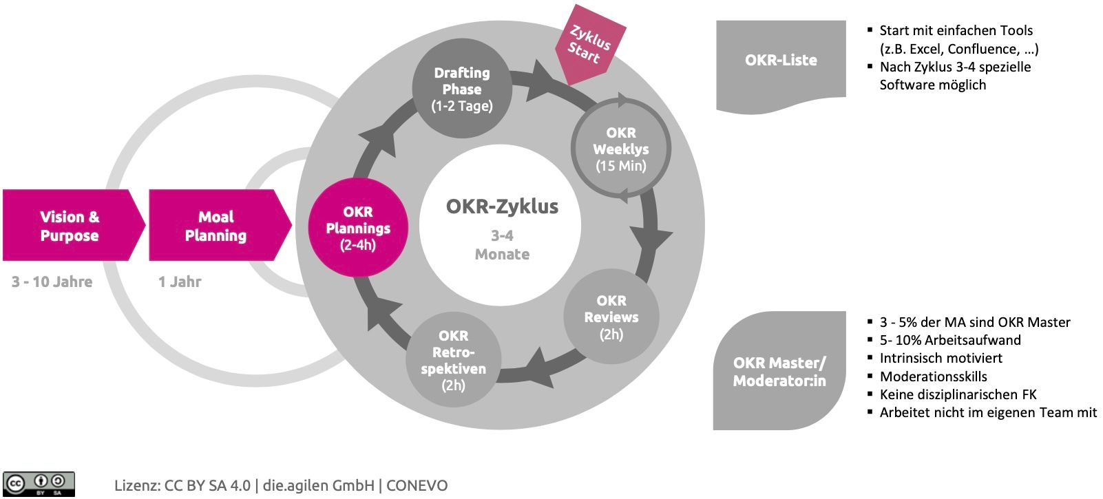 - Maßnahmen vor allem im oder vor dem ersten Zyklus, wie etwa die Ausbildung von OKR Moderator:innen, Orientierungsworkshops, erstmals extern moderierte Plannings, Review und Retrospektiven zum Lernen und im Shdowing mit den internen OKR Moderator:innen steigern die Lernqualität und -geschwindigkeit.